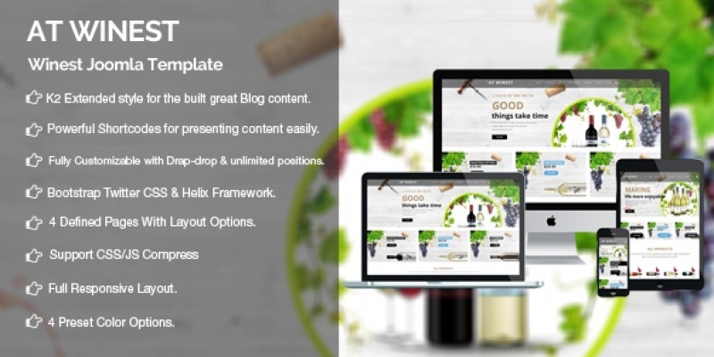 AT Winest is Responsive VirtueMart Joomla template that targets for wine store websites. It’s especially designed to stimulate the viewers’ creativity and desire for fine quality wine. Our layouts promote modern & dynamic designs that impress any wine lover and offer an amazing experience for anyone landing your pages. Also, they are extremely easy to install and implement. If you know how to do it, selling and presenting wine online can be a very profitable business. Moreover, it makes the products more appealing to visitors and increase sales with attractive design. To compensate the fact that your viewers won’t be able to actually see the wonderful color of the wine and they won’t be able to sense the flavor or amazing texture, we used high quality images. Make your sites displaying on all mobile devices with 100% responsive layout. Besides, it builds on powerful framework with completely Bootstrap CSS Framework, Support Font Awesome and K2 extended style. AT Winest is integrated with VirtueMart and may display products using 8 available views. After that, it comes with 4 color styles and boxed layout helping to create perfect websites with various layouts.