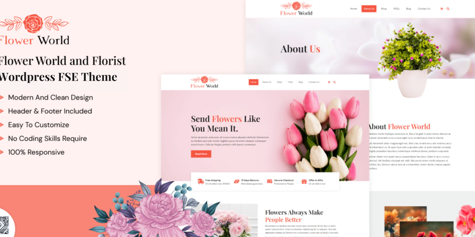 The Flower World WordPress Theme includes more than twelve inner pages and an amazing and creative homepage design. Every font and color in this theme is controlled by the global setting of the Full Site Editor. Consequently, acquire your Flower World gear immediately!