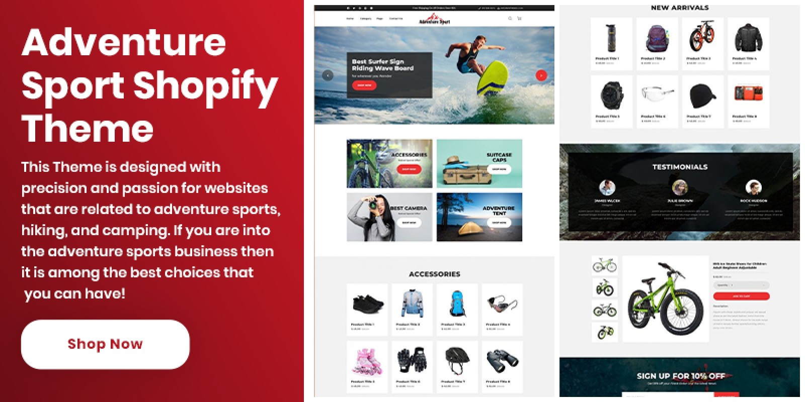 Adventure Sports Shopify Theme is a clean and skillfully crafted theme with a contemporary feel that represents your adventure sports club in style. It is great for those who provide training for any adventure sports or are themselves an adventure sports player then they may also represent their portfolio using this wonderful theme. This theme is a beautiful combination of sporty look and other elements that would steal the attention of the audience. Through your website, you can encourage your audience to attain a new level of physical endurance and excitement by opting for adventure sports. You will be able to get a content-focused adventure sports site as this theme is designed exclusively for such websites.